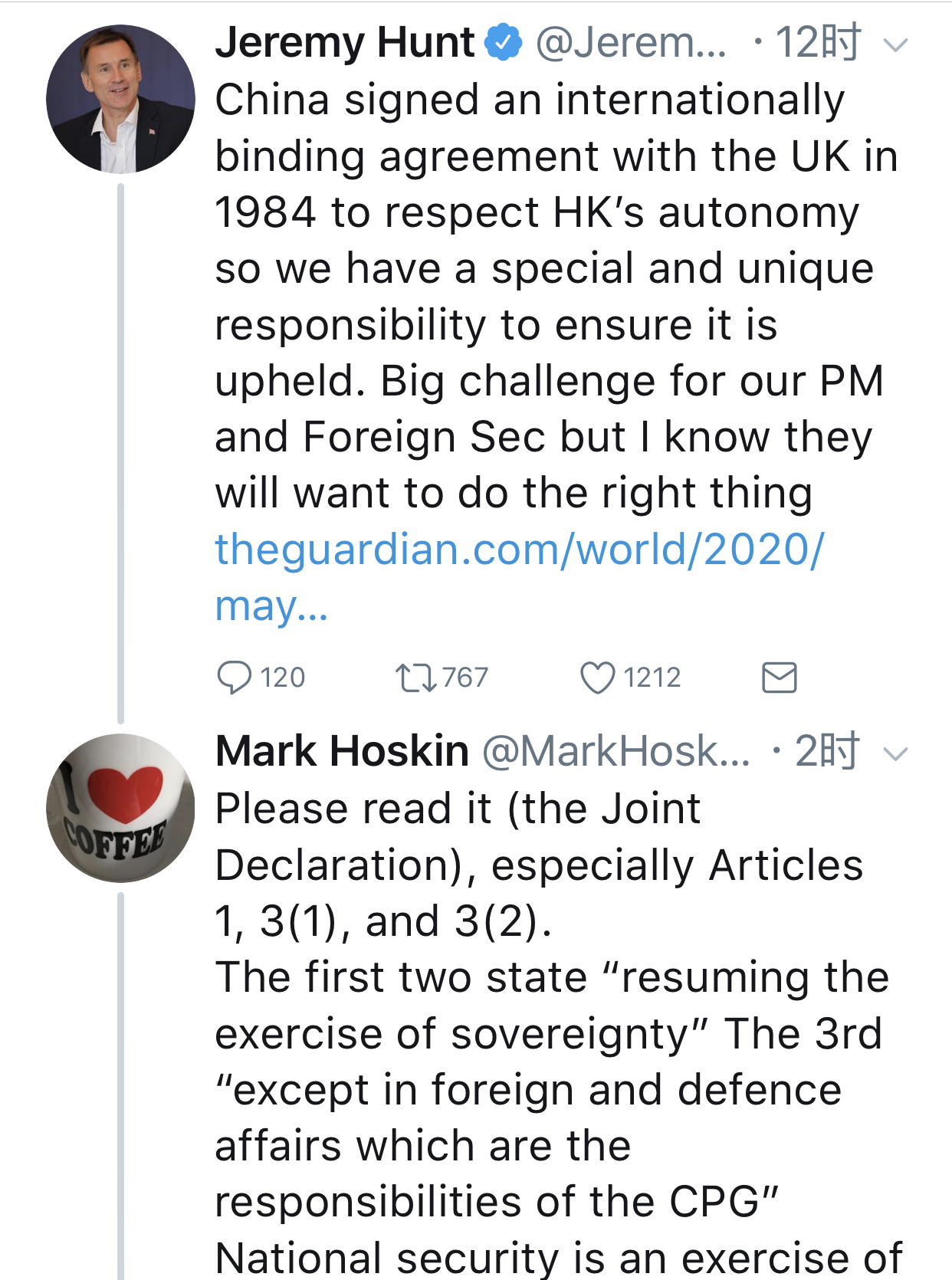 一位英國歷史研究者在社交媒體上提醒對香港事務嘰嘰歪歪的英國前外交大臣,請他仔細讀讀中英聯(lián)合聲明。其中第一章第一條款就寫著:“中華人民共和國政府聲明,收回香港地區(qū)(包括香港島九龍和新界,以下稱香港)是全中國人民的共同愿望,中華人民共和國政府決定于1997年7月1日對香港恢復行使主權。”
