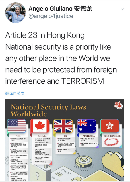 一位定居在香港的瑞士籍人士Angelo Giuliano(中文名安德龍)在社交媒體上發(fā)推表示:“就像這世界上所有地方一樣,針對香港的國安立法是最首要的,該法律能夠保護我們不受外國干涉和恐怖主義的威脅。”
