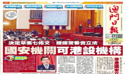 △《澳門日報》頭版頭條大篇幅報道涉港國家安全立法