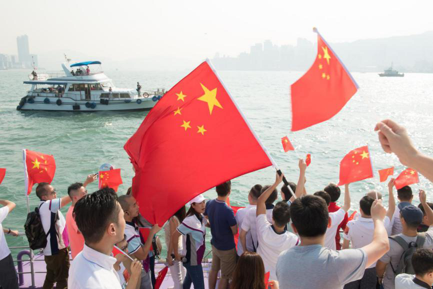 2019年10月1日,約300名香港市民在維多利亞港,以游船方式慶祝新中國成立70周年。新華社記者 翁忻旸 攝