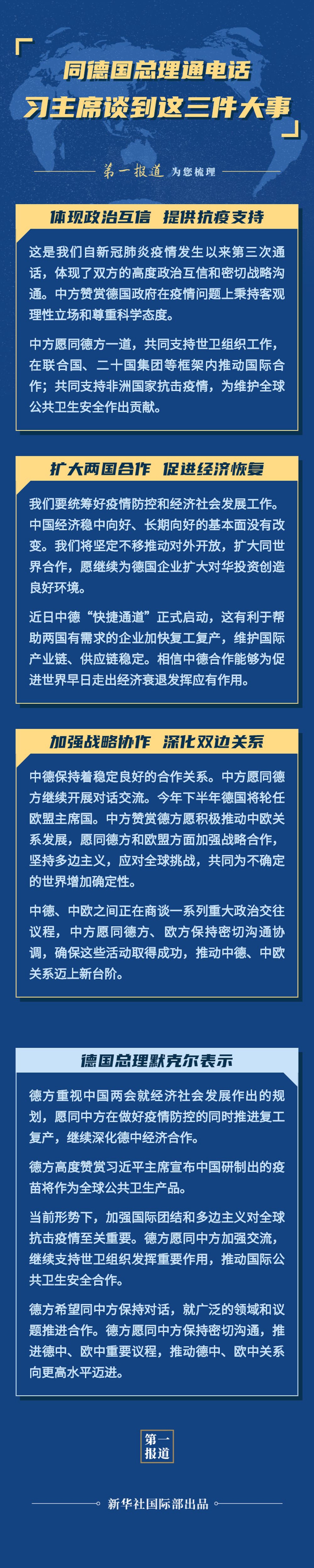 這是自新冠肺炎疫情發生以來,習主席同默克爾總理第三次通話。通話信息豐富,“第一報道”為您梳理——