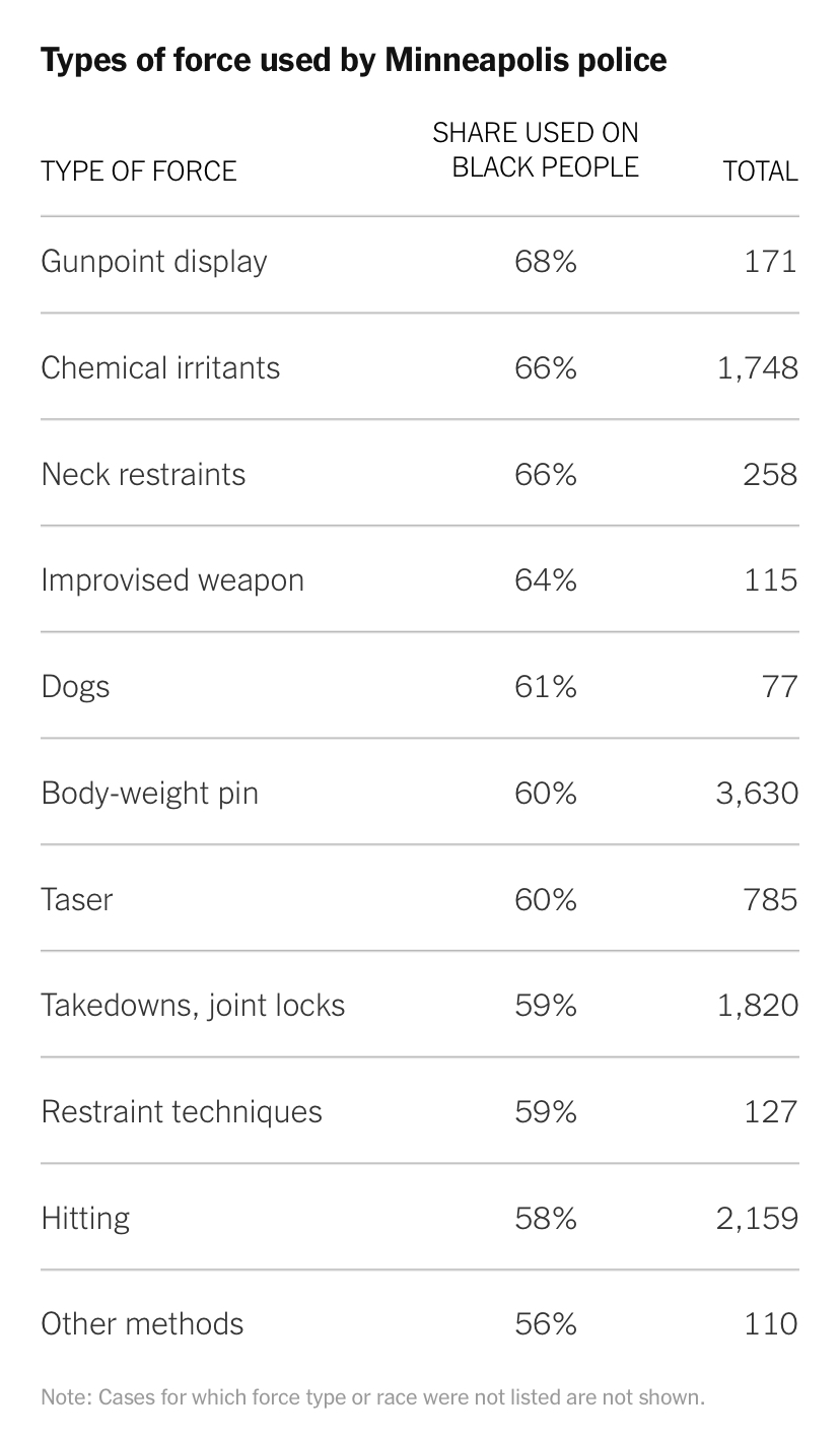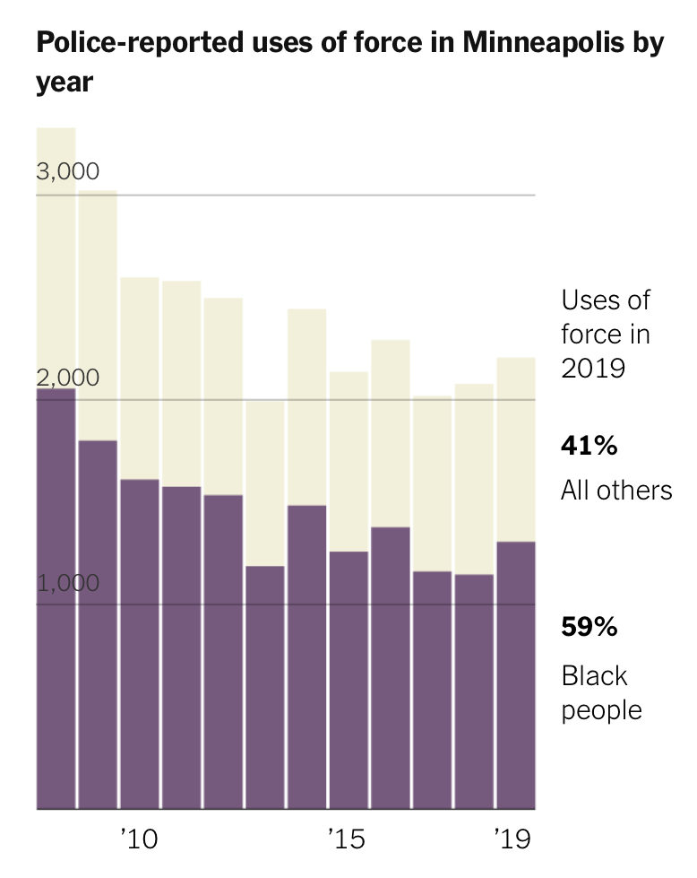 據《紐約時報》報道,在非裔人口不到20%的明尼阿波利斯市,當地警方使用武力的對象60%均為非裔。2015年以來,明尼阿波利斯警方記錄了11500次警方使用武力案件,其中至少6650次的武力施加對象為非裔。與此相比,占明尼阿波利斯市總人口約60%的白人,只經歷了其中的2750次。