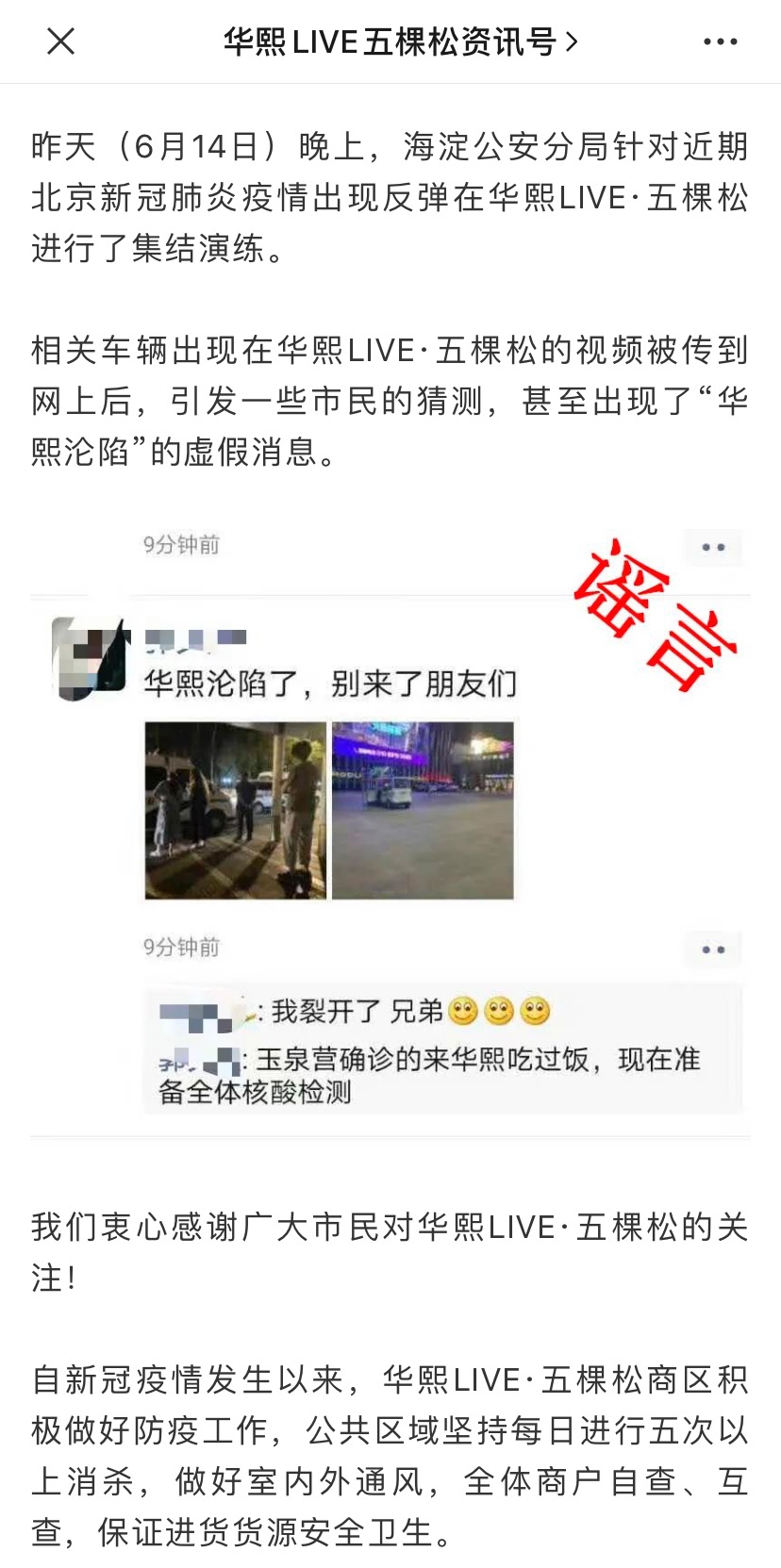 6月15日,華熙Live官方微信發布通告辟謠“淪陷”傳言稱,華熙Live為配合海淀公安分局集結演練提供場地,“華熙淪陷”屬謠言。