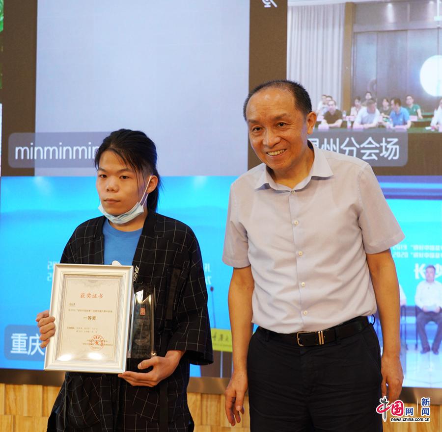 重慶大學(xué)黨委副書記王旭(左)在重慶分會(huì)場(chǎng)為一等獎(jiǎng)作品《左手》頒獎(jiǎng)。向冰冰攝