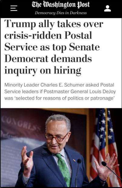 6月14日,民主黨已正式要求調查該任命,并質疑德喬伊在如此復雜的政經背景下,是否能夠平衡自身使命與利益。參院少數黨領袖查爾斯·舒默在致郵政局董事會的信件中表示,“他在與郵政局有業務往來的公司中擁有的財務利益,以及他廣泛的籌款活動,均讓人擔心他作為聯邦雇員,如何平衡并規范道德利益沖突和黨派政治活動”,舒默要求董事會公開其與白宮就新局長任命的溝通記錄。