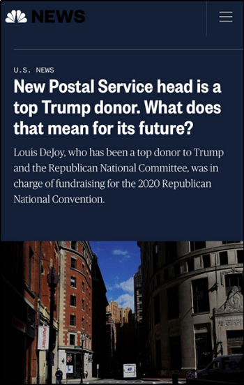 △美國全國廣播公司指出,美國郵政局局長按程序規定應由該機構董事會任命,以避免卷入政治紛爭