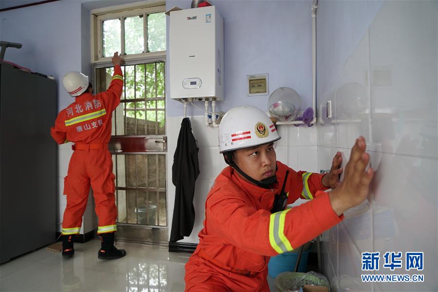7月12日,消防救援人員在河北省唐山市古冶區卑家店鎮前巍峰山村村民家中排查。 新華社記者 牟宇 攝
