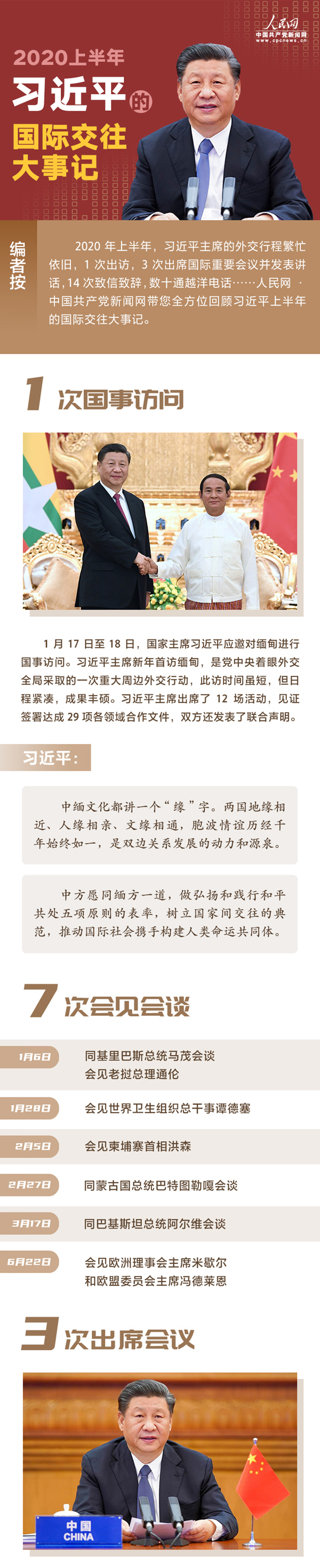 細數今年上半年,習近平夙夜在公,勤勉工作,不斷刷新“忙碌指數”:數十次出席重要會議部署各項工作,8次國內考察,調研足跡遍及7省區市,3次出席國際重要會議并發表講話,20余次致信、回信海內外人士,60次就疫情防控等話題與40余位外國政要和國際組織負責人通電話……人民網·中國共產黨新聞網推出系列圖解報道,帶您全方面回顧習近平的2020上半年。