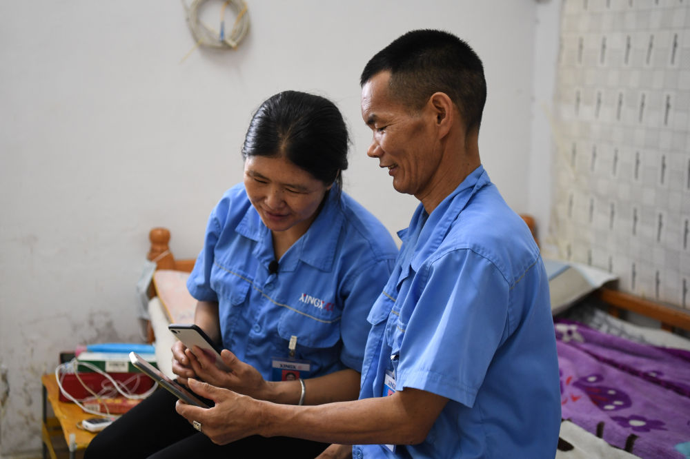 在佛山市三水區(qū)廣東星星制冷設(shè)備有限公司提供的夫妻宿舍里,李力挖(右)、何公各在休息時(shí)間玩手機(jī)(6月22日攝)。新華社記者鄧華攝