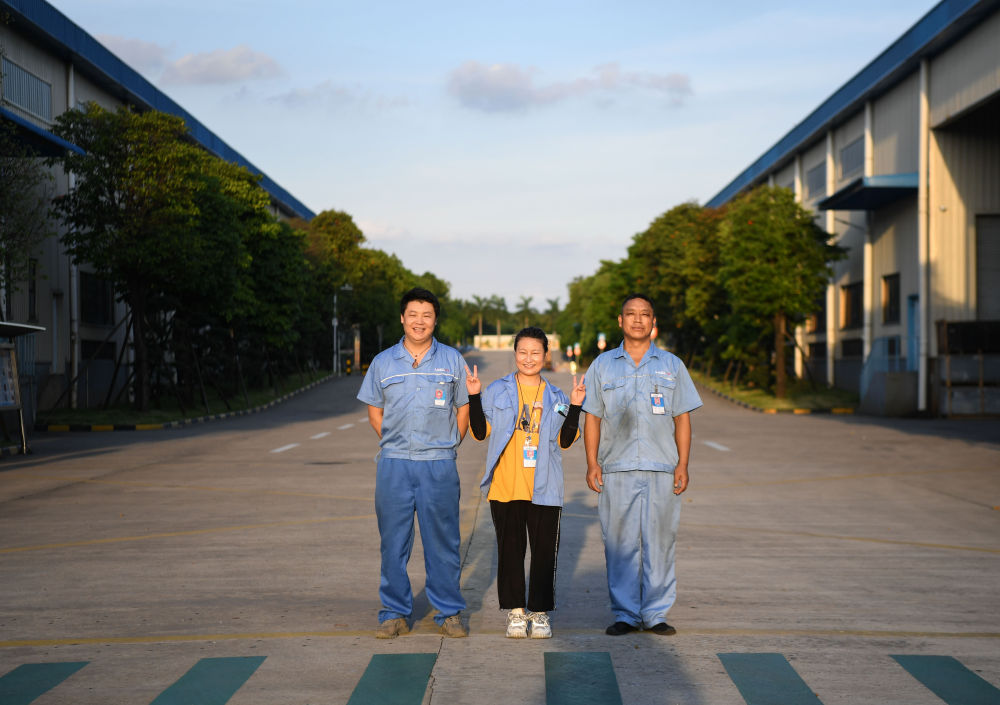 在佛山市三水區(qū)廣東星星制冷設(shè)備有限公司車間內(nèi),來(lái)自四川涼山彝族自治州鹽源縣的何公各(左二)和工友們合影(6月22日攝)。新華社記者鄧華攝