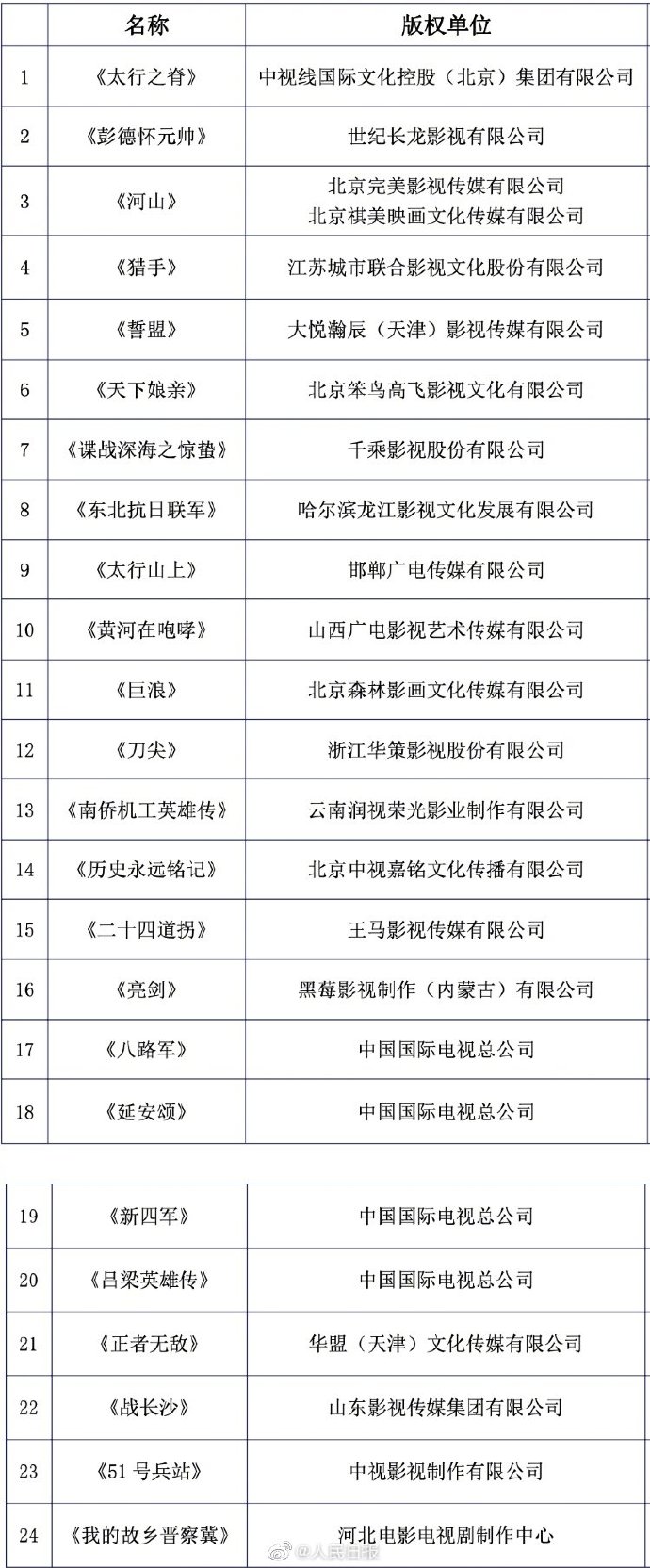 7月16日,國家廣播電視總局下發通知,即日起各級電視播出機構要精心遴選播出抗戰題材優秀電視劇。廣電總局從新創作和已播出抗戰題材電視劇中精選出部分劇目,作為各級電視臺播出參考,其中包括《彭德懷元帥》《河山》《亮劍》《諜戰深海之驚蟄》《南僑機工英雄傳》《戰長沙》等24部劇目。