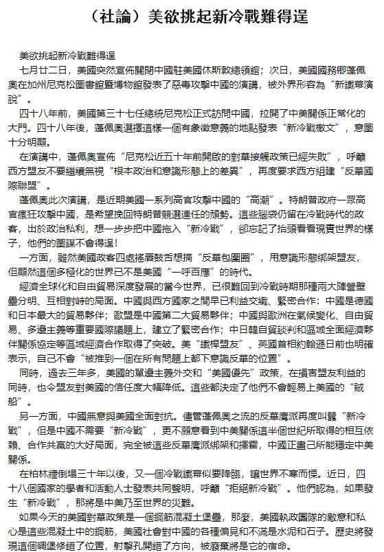 澳門地區發行量最大的報紙《澳門日報》28日發表以《美欲挑起新冷戰難得逞》為題的社評。社評指出,特朗普政府一眾高官瘋狂攻擊中國,是希望挽回特朗普競選連任的頹勢。這些腦袋仍留在冷戰時代的政客,出于政治私利,想一步步把中國拖入“新冷戰”,卻忘記了抬頭看看現實世界的樣子,他們的圖謀不會得逞!