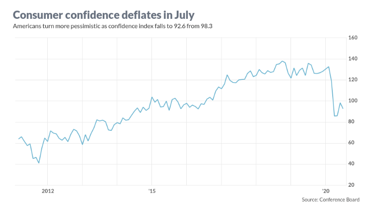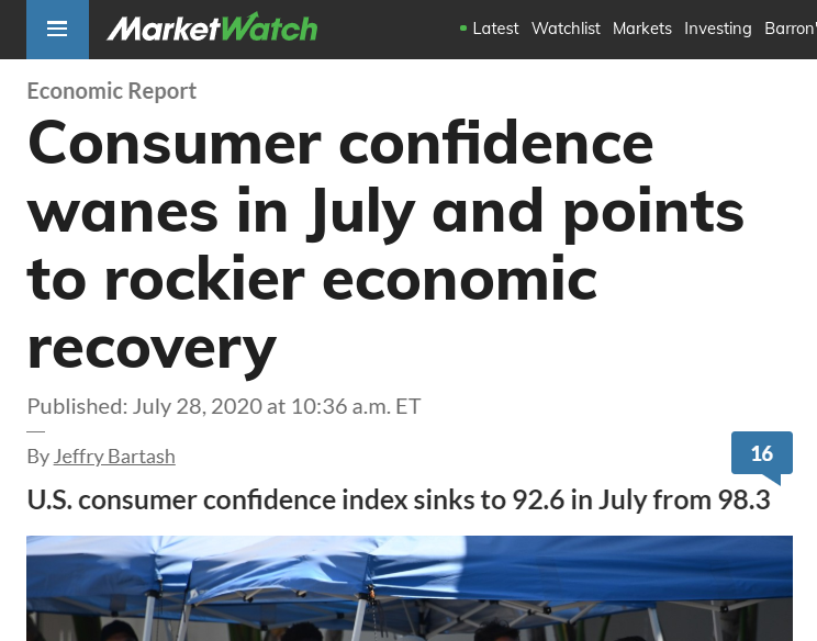 當?shù)貢r間7月28日,美國咨商會公布最新數(shù)據(jù)顯示,美國7月消費者信心指數(shù)為92.6,低于6月98.3的修正值,反彈趨勢戛然而止。7月消費者信心下滑的主要原因,與新冠肺炎疫情在全美各地反彈直接相關。經(jīng)濟學家普遍認為,在公眾確信疫情得到控制之前,美國經(jīng)濟中最重要的消費者支出難以恢復正常水平,美國經(jīng)濟也就難以實現(xiàn)復蘇。