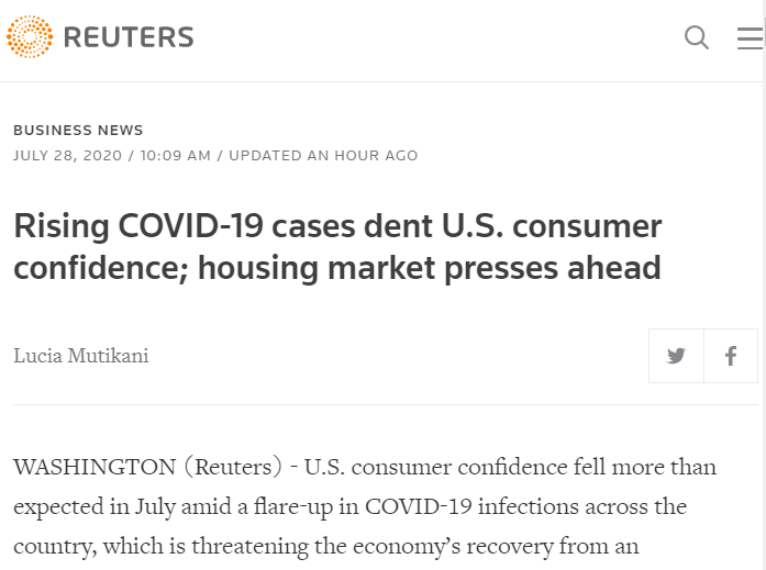 △路透社稱,疫情反彈削弱了美國消費者信心
