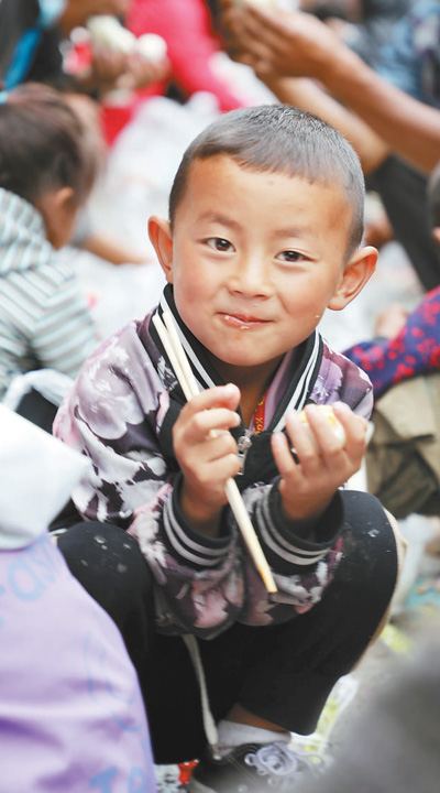 四川冕寧縣發生特大暴雨災害,武警涼山支隊官兵在多個安置點開展提供熱食、消毒防疫、巡診送藥和心理疏導等工作。圖為6月29日,一男孩在大馬烏村安置點吃早餐。李結義攝(影像中國)