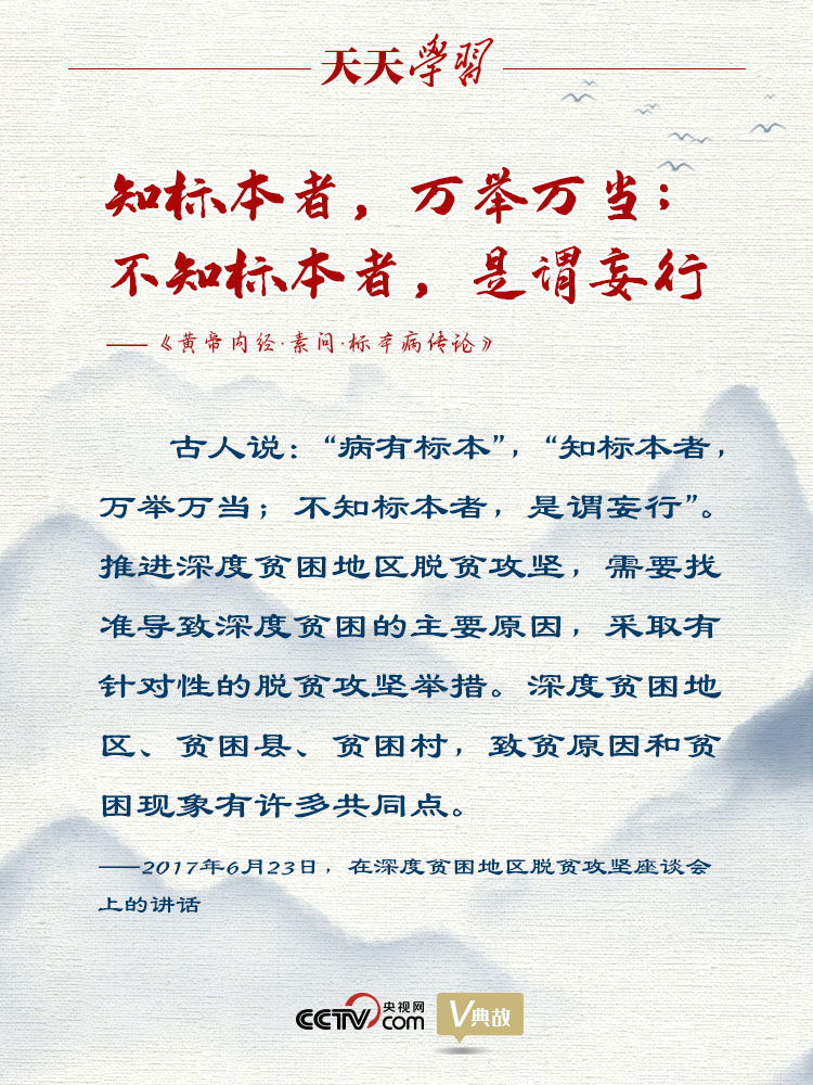 2017年6月23日,習近平總書記主持召開深度貧困地區脫貧攻堅座談會并發表重要講話。他在講話中引用古語“病有標本”“知標本者,萬舉萬當;不知標本者,是謂妄行”,指出深度貧困地區、貧困縣、貧困村,致貧原因和貧困現象有許多共同點。推進深度貧困地區脫貧攻堅,需要找準導致深度貧困的主要原因,采取有針對性的脫貧攻堅舉措。