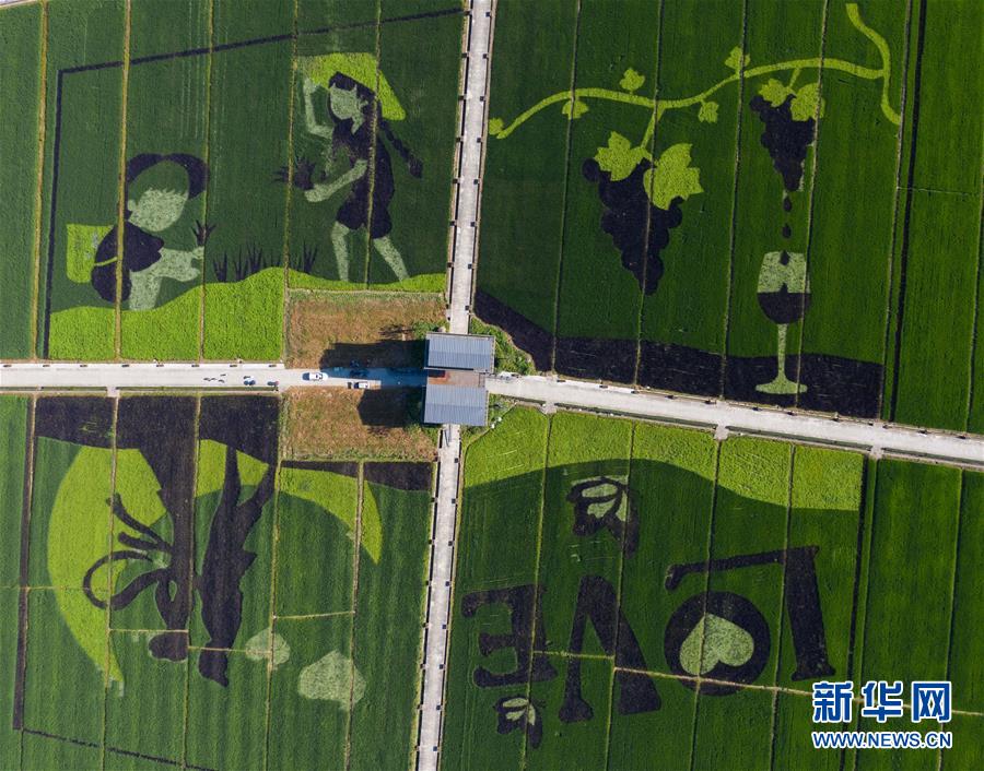 空中俯瞰東洲街道紅旗村的“藝術稻田”水稻畫“牛郎織女”(8月12日攝,無人機照片)。 進入8月中旬,浙江省杭州市富陽區東洲街道紅旗村的300畝“藝術稻田”里的水稻畫進入最佳觀賞期!捌咸衙谰啤薄芭@煽椗薄暗咎锊逖怼钡忍厣珗D案成了當地鄉村旅游的亮點。近年來,杭州市富陽區東洲街道積極推動美麗田園建設,打造以鄉村旅游、農事采摘、農家樂民宿為主題的鄉村文旅融合發展之路。 新華社記者 徐昱 攝