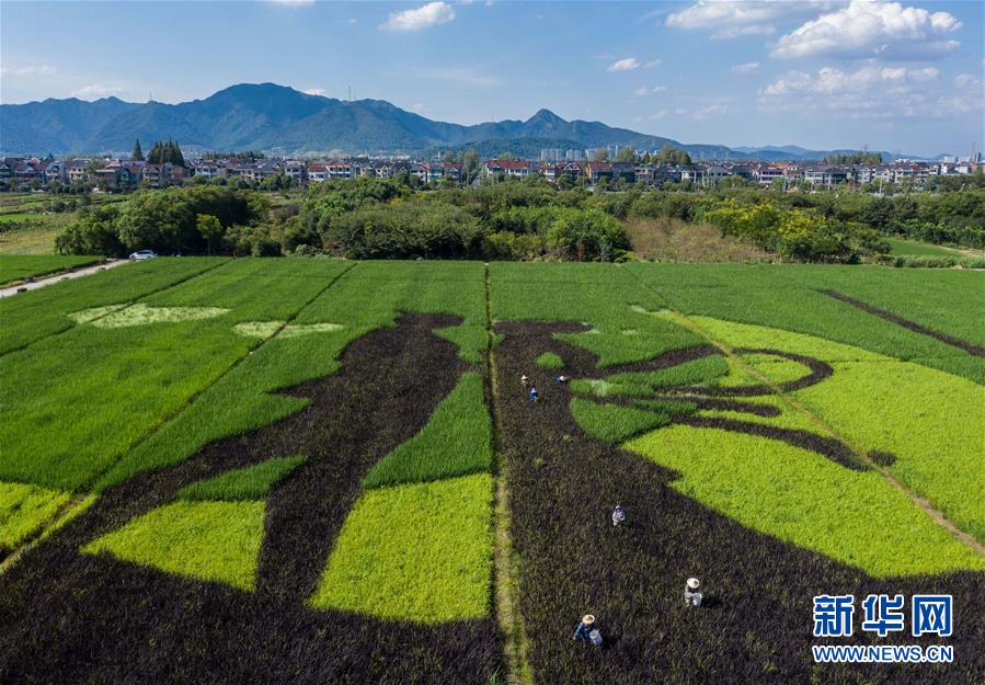 這是東洲街道紅旗村的“藝術稻田”水稻畫(8月12日攝,無人機照片)。 進入8月中旬,浙江省杭州市富陽區東洲街道紅旗村的300畝“藝術稻田”里的水稻畫進入最佳觀賞期!捌咸衙谰啤薄芭@煽椗薄暗咎锊逖怼钡忍厣珗D案成了當地鄉村旅游的亮點。近年來,杭州市富陽區東洲街道積極推動美麗田園建設,打造以鄉村旅游、農事采摘、農家樂民宿為主題的鄉村文旅融合發展之路。 新華社記者 徐昱 攝