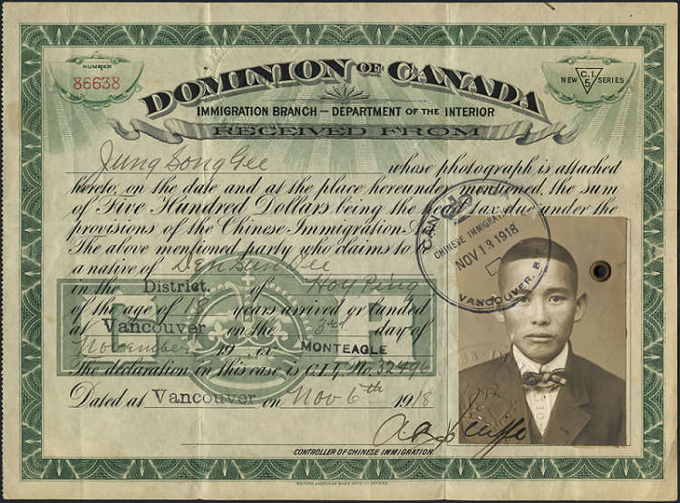 △加拿大政府1918年向華人征收“人頭稅”的票證