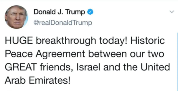 特朗普在社交媒體上高調宣稱,以阿和平協議是“巨大突破”。他在白宮對媒體說,以色列和阿聯酋未來幾周將在白宮正式簽署協議。