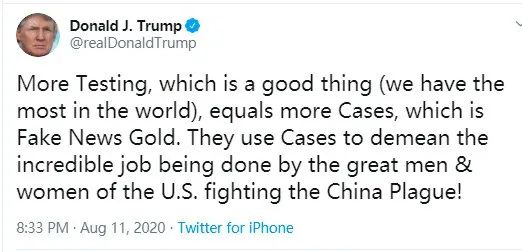 對(duì)于正全力爭(zhēng)取連任的美國(guó)總統(tǒng)特朗普來說,本國(guó)疫情的失控已經(jīng)成了他最大的一塊心病。為此,他日前再發(fā)推文,為自己的抗疫不力辯護(hù):“更多的病毒檢測(cè)雖然是件好事,但也等于出現(xiàn)了更多病例,而這會(huì)給媒體制造‘假新聞’提供炮彈,詆毀美國(guó)人為應(yīng)對(duì)‘中國(guó)瘟疫’所做出的偉大努力。”