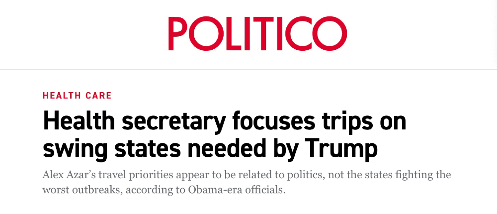 奧巴馬時(shí)期的官員就曾指出,阿扎出行地點(diǎn)的選擇似乎優(yōu)先考慮的是政治因素,而不是疫情嚴(yán)重程度。據(jù)美國(guó)政治新聞網(wǎng)站Politico報(bào)道,自4月下旬以來,阿扎的11次出行當(dāng)中,有9次的目的地都是總統(tǒng)特朗普急需爭(zhēng)取選票的“搖擺州”。