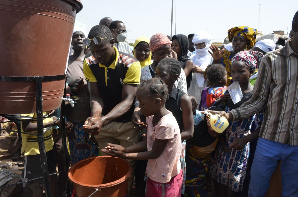 4月3日,人們在馬里首都巴馬科市中心的一處市場的洗手裝置處洗手。新華社發(哈比卜·庫亞特攝)