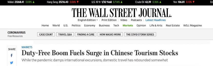 《華爾街日報》近日發(fā)表題為《免稅熱潮助推中國旅游業(yè)股票大漲》的文章。文章指出,雖然新冠肺炎疫情影響國際旅游,但中國國內旅游熱度有所回升,中國旅游業(yè)迅速回暖,并促進中國經(jīng)濟第二季度恢復增長。
