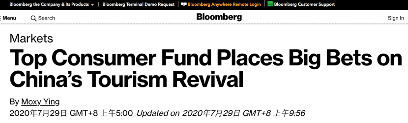 彭博社7月29日一篇報道同樣關注到這一點。彭博社報道稱,就在新冠疫情迫使世界各國封閉邊界之際,國際頂尖基金公司看好中國旅游業(yè)復蘇。韓國未來資產(chǎn)亞洲卓越消費股票基金(Mirae Asset Asia Great Consumer Equity Fund)首席投資組合經(jīng)理安珠熙(Joohee An)對中國國內旅游市場寄予厚望,并買入了與中國旅游業(yè)相關的股票。