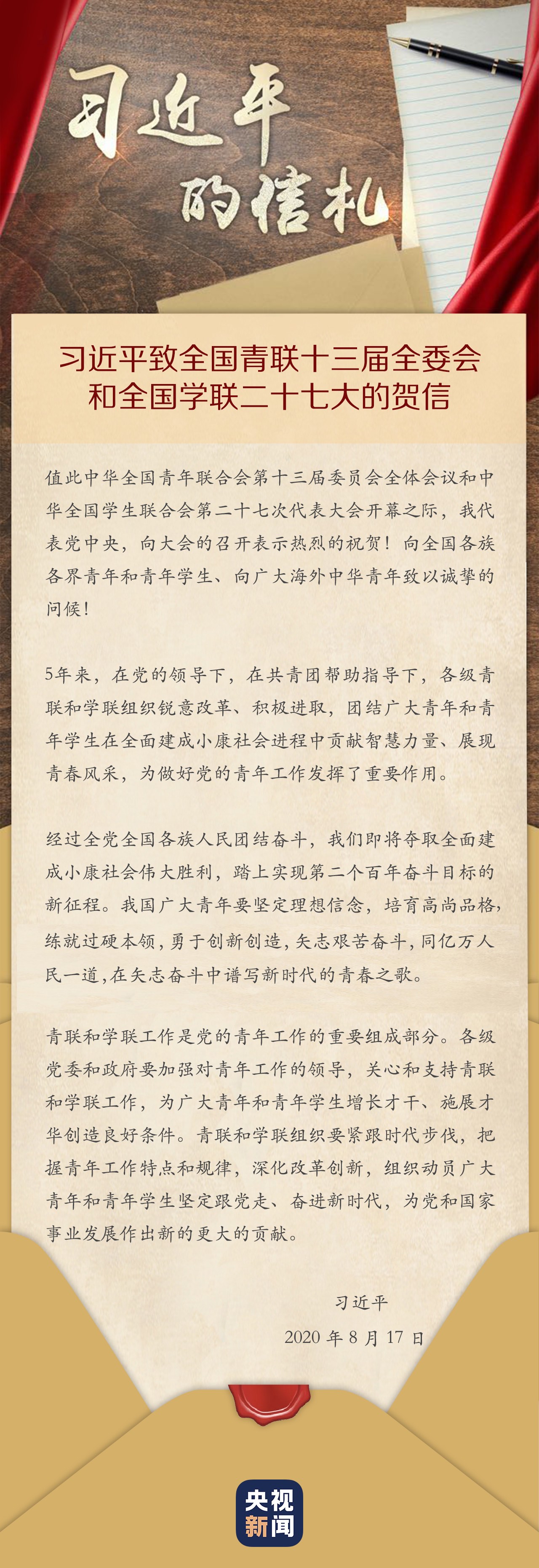 中華全國(guó)青年聯(lián)合會(huì)第十三屆委員會(huì)全體會(huì)議、中華全國(guó)學(xué)生聯(lián)合會(huì)第二十七次代表大會(huì)8月17日在北京開(kāi)幕。習(xí)近平總書記發(fā)來(lái)賀信,代表黨中央,向大會(huì)的召開(kāi)表示熱烈的祝賀,向全國(guó)各族各界青年和青年學(xué)生、向廣大海外中華青年致以誠(chéng)摯的問(wèn)候。