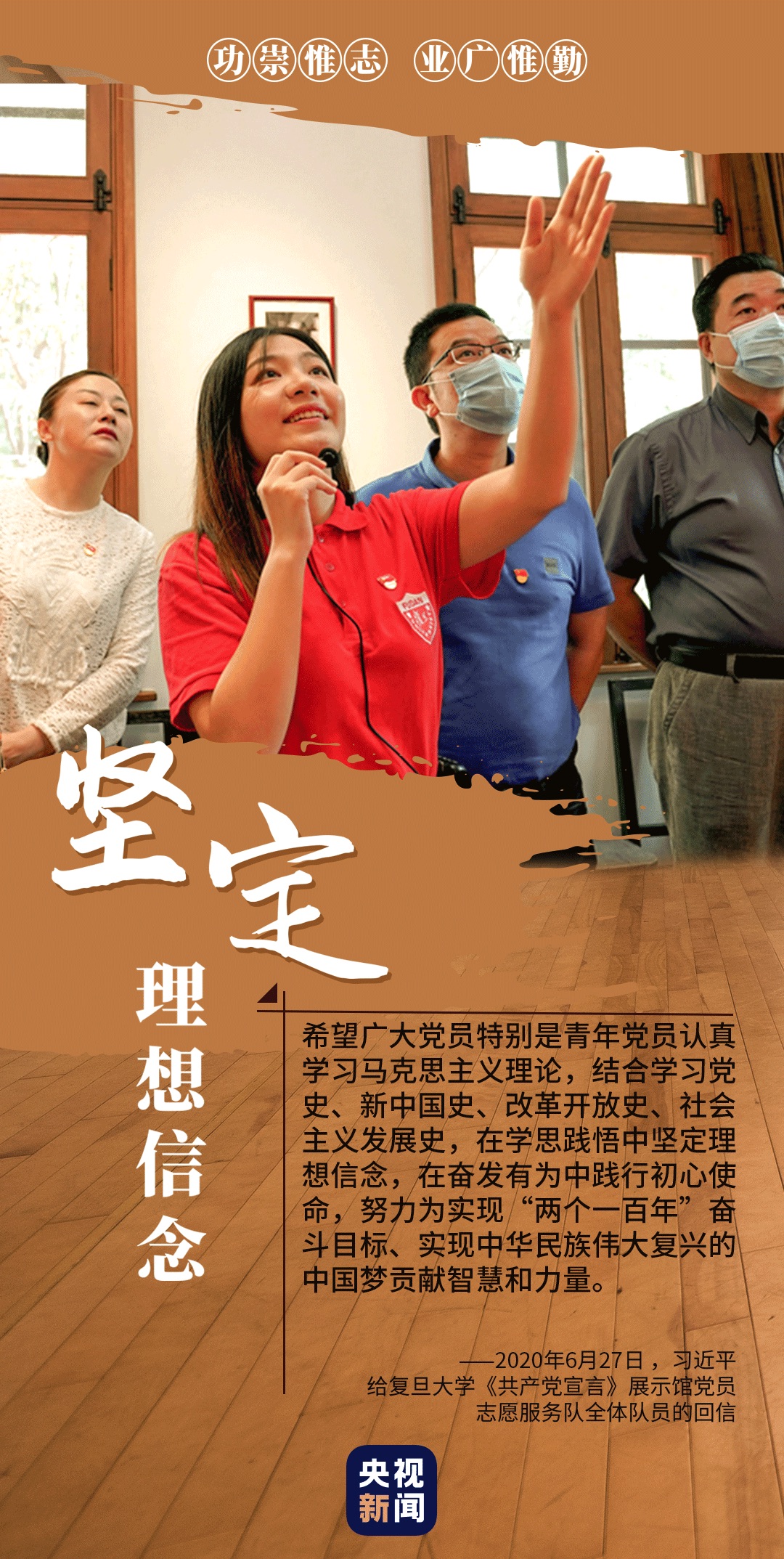 心有所信,方能行遠(yuǎn)。2020年6月底,習(xí)近平在給復(fù)旦大學(xué)《共產(chǎn)黨宣言》展示館黨員志愿服務(wù)隊(duì)全體隊(duì)員回信時(shí)說(shuō),面向未來(lái),走好新時(shí)代的長(zhǎng)征路,我們更需要堅(jiān)定理想信念、矢志拼搏奮斗。