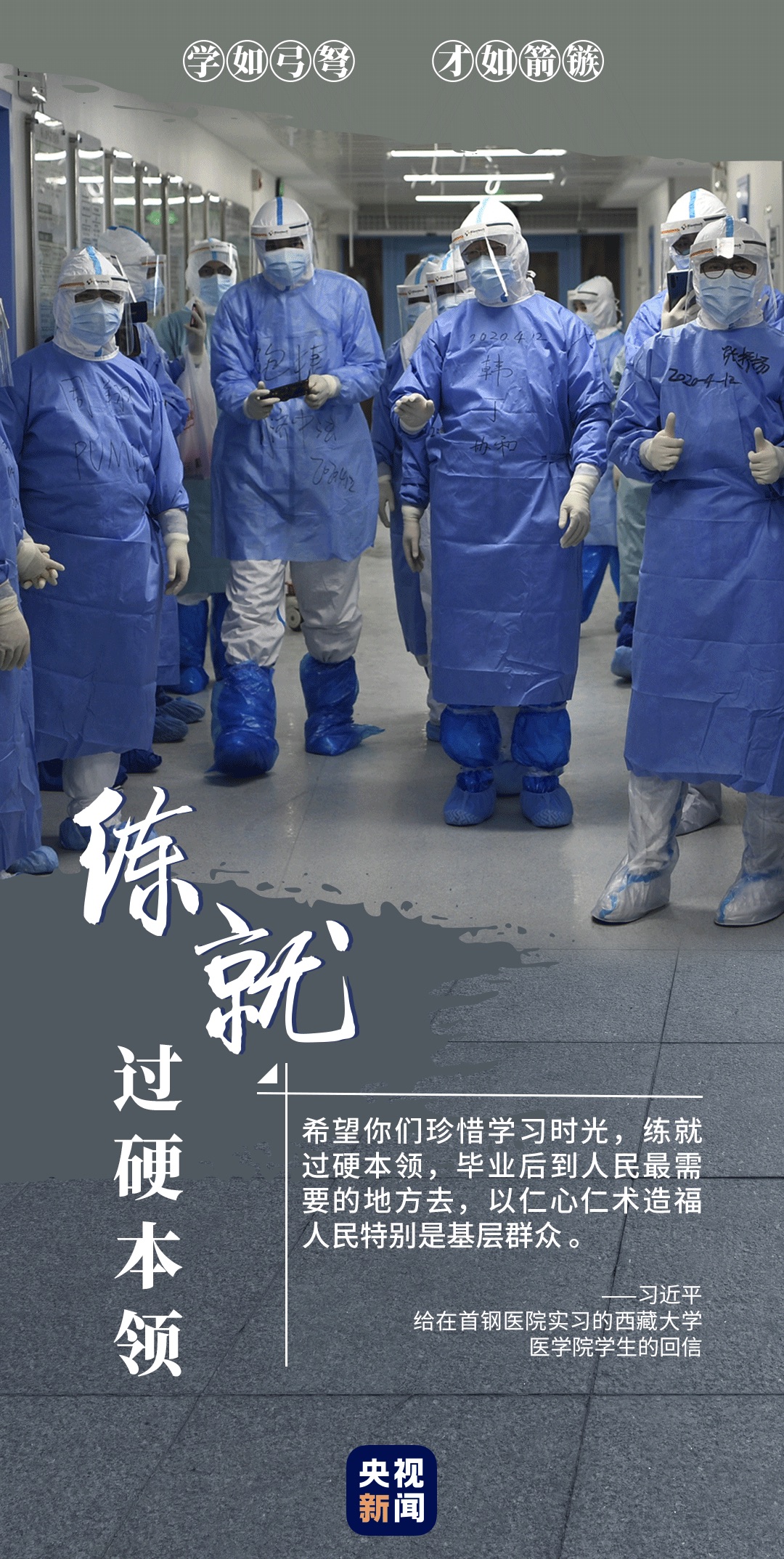 練過(guò)硬本領(lǐng),做新時(shí)代奮斗者。在決勝全面小康、決戰(zhàn)脫貧攻堅(jiān)的收官之年,在實(shí)現(xiàn)“兩個(gè)一百年”奮斗目標(biāo)的歷史交匯之年,新時(shí)代中國(guó)青年同億萬(wàn)人民一道,在實(shí)現(xiàn)中華民族偉大復(fù)興中國(guó)夢(mèng)的新長(zhǎng)征路上奮勇搏擊。