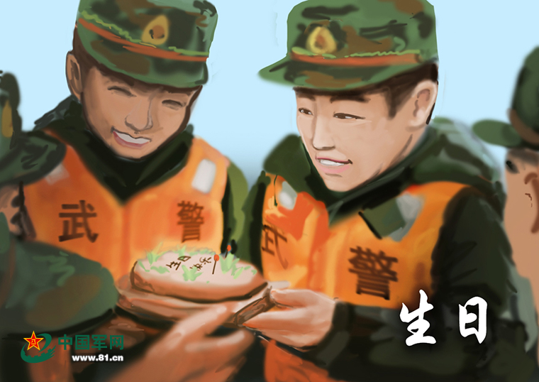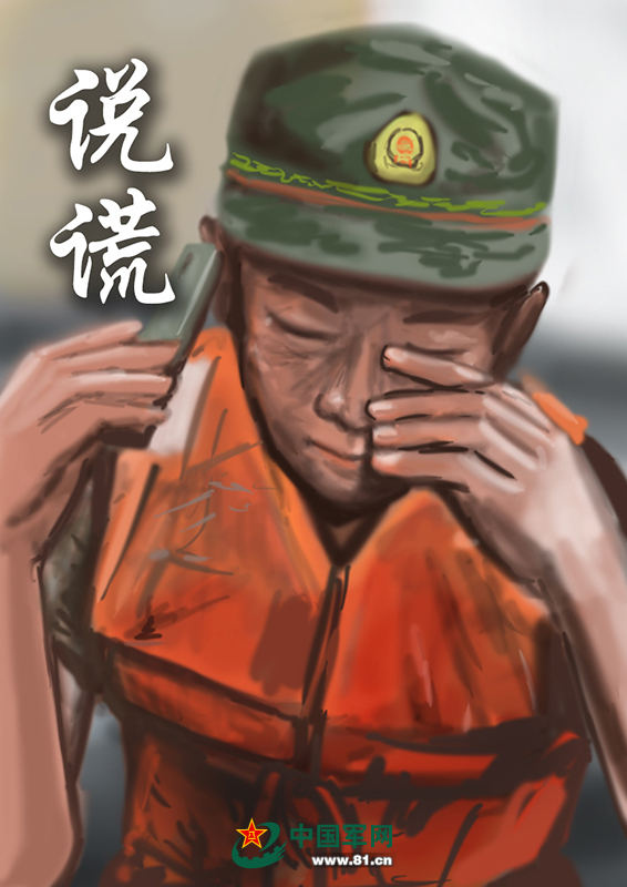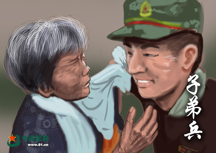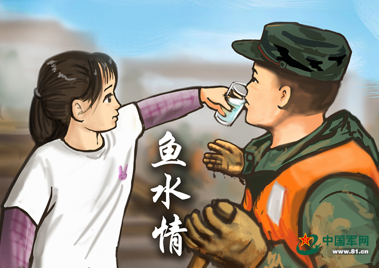 小女孩踮腳給滿手泥的兵哥哥喂水