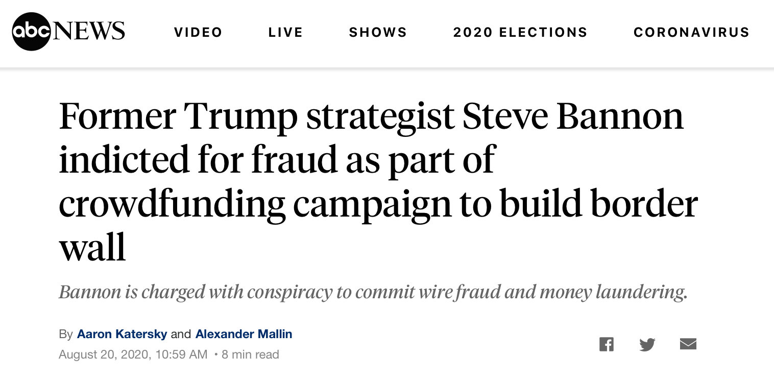 △ABC新聞稱,前特朗普戰略師史蒂夫·班農在“建墻”一募捐活動中被控欺詐