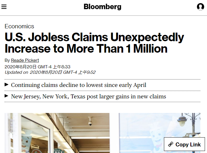 美國勞工部8月20日發布數據顯示,截至8月15日的一周內,美國首次申請失業救濟人數環比增加13.5萬,達110.6萬人,高于彭博社經濟學家調查預估中值的92萬人。這是該指標自此前一周降至97.1萬之后,再度突破100萬大關。