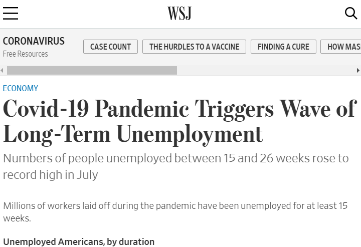 △《華爾街日報》稱,新冠肺炎疫情引發長期失業浪潮,7月美國失業15至26周的人數創紀錄