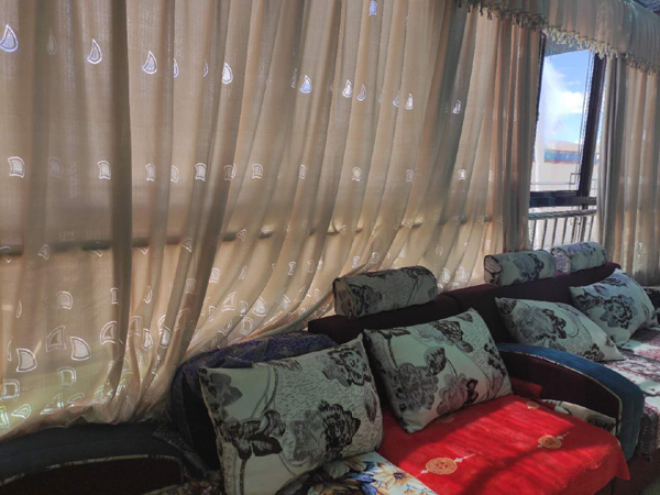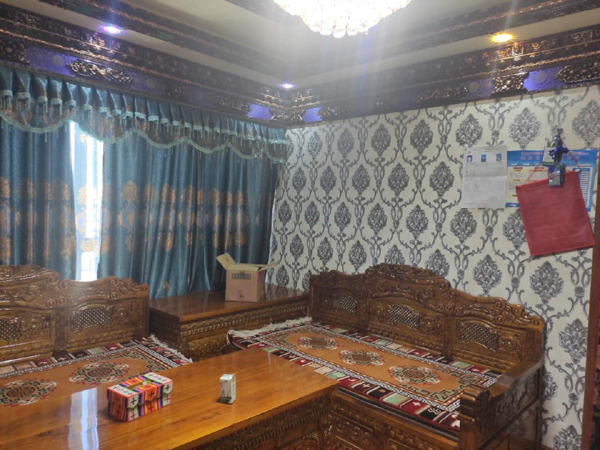 掀開門簾進屋,左手邊是客廳。吊燈和四周圍繞一圈的小筒燈,照得屋里亮堂堂。各種家具都是新添置的,一應(yīng)俱全。提到過去居住的房子,白瑪拉珍說:“之前的房子不好,只有三間房,全家人都擠在一個房間里睡,廚房也是這間屋子。”