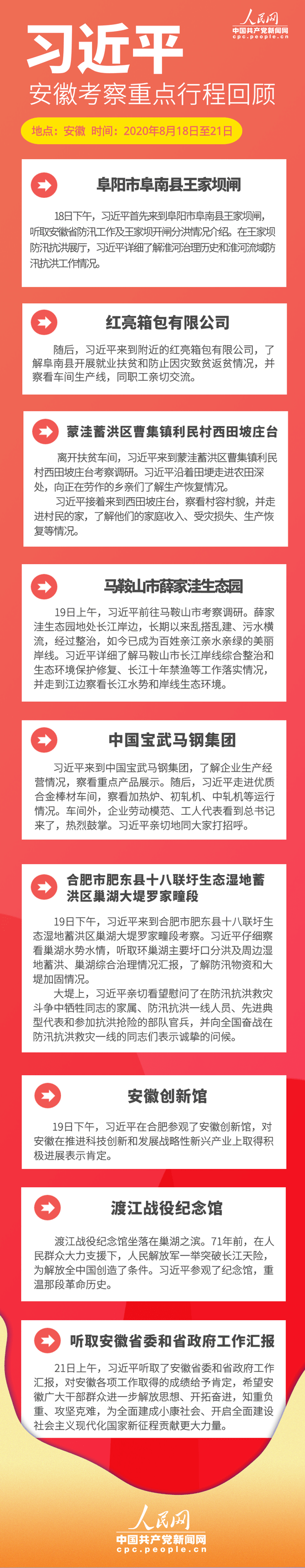 8月18日至21日,習(xí)近平來(lái)到安徽,看望慰問受災(zāi)群眾和防汛救災(zāi)一線人員,就統(tǒng)籌推進(jìn)常態(tài)化疫情防控和經(jīng)濟(jì)社會(huì)發(fā)展工作、加強(qiáng)防汛救災(zāi)和災(zāi)后恢復(fù)重建、推進(jìn)長(zhǎng)三角一體化發(fā)展、謀劃“十四五”時(shí)期經(jīng)濟(jì)社會(huì)發(fā)展進(jìn)行調(diào)研。