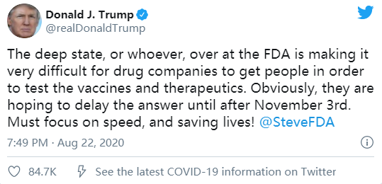 當(dāng)?shù)貢r(shí)間8月22日,特朗普在社交媒體上“炮轟”美國食品藥品監(jiān)督管理局(FDA),指責(zé)該機(jī)構(gòu)“有人故意拖延疫苗試驗(yàn)”,推遲新冠疫苗和藥物療法的開發(fā),導(dǎo)致可能要到11月大選過后才會(huì)有疫苗。他在這篇推文中還特意“點(diǎn)名”該機(jī)構(gòu)局長斯蒂芬·哈恩。