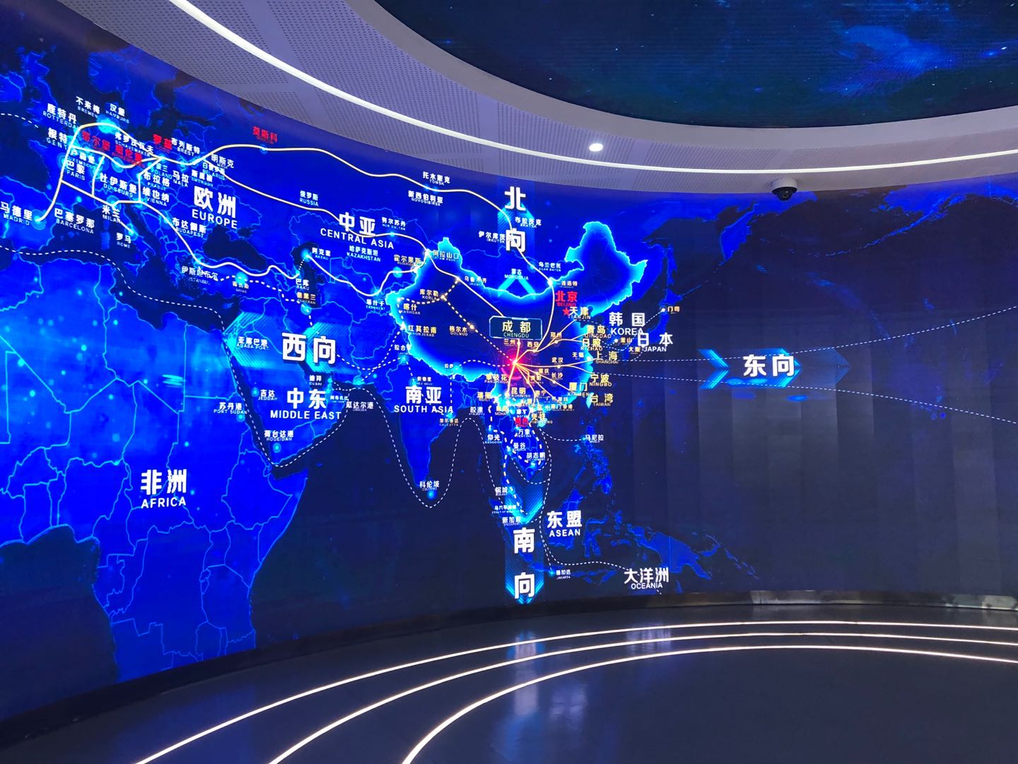 走進(jìn)成都國(guó)際鐵路港展示中心,映入眼簾的藍(lán)色大屏幕展示了中歐班列(成都)連接的站點(diǎn)和詳細(xì)的線路。2013年4月,首班中歐班列(成都)從成都國(guó)際鐵路港始發(fā),經(jīng)過(guò)7年耕耘,已聯(lián)接境外波蘭羅茲、德國(guó)紐倫堡、荷蘭蒂爾堡等30個(gè)城市,欽州、上海等境內(nèi)15個(gè)城市,打造7條國(guó)際鐵路通道和5條國(guó)際鐵海聯(lián)運(yùn)通道。