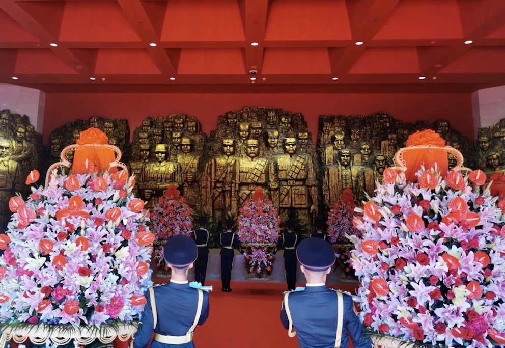 △禮兵將花籃抬入紀念館序廳。(總臺央視記者黃京輝拍攝)