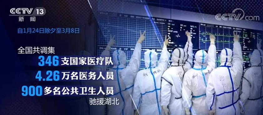 自1月24日除夕至3月8日,全國共調集346支國家醫療隊、4.26萬名醫務人員、900多名公共衛生人員馳援湖北。19個省份以對口支援、以省包市的方式支援湖北省除武漢市以外16個地市。