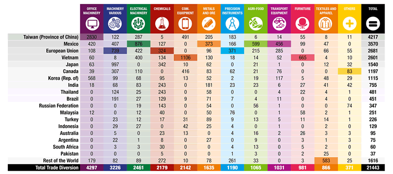 △2019年上半年美國(guó)市場(chǎng)貿(mào)易分流(百萬(wàn)美元),排名前5為中國(guó)臺(tái)灣省、墨西哥、歐盟、越南、日本