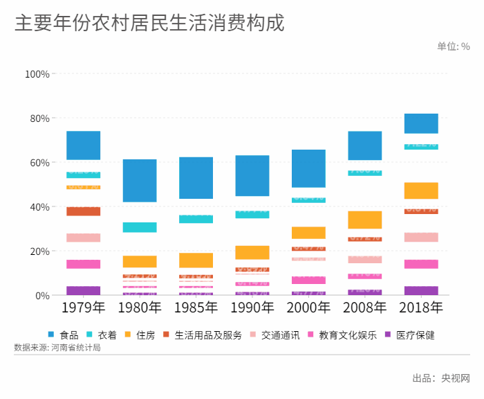黨的十一屆三中全會以后,河南農(nóng)村居民收入水平迅速提高,生活消費狀況很快得到根本改善。2018年,全省農(nóng)村居民人均生活消費支出提高到10392元,是1949年的272.8倍,年均增長8.5%;是1978年的127.2倍,年均增長12.9%。