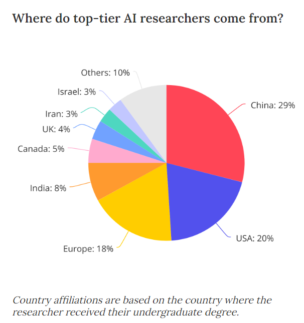 作為世界上最大的移民國(guó)家,美國(guó)在眾多領(lǐng)域的領(lǐng)先地位離不開國(guó)際人文交流的貢獻(xiàn)。保爾森基金會(huì)智庫(kù)馬克·波羅最新發(fā)布的報(bào)告顯示,美國(guó)科技進(jìn)步與中國(guó)人才輸入密切相關(guān),以人工智能領(lǐng)域?yàn)槔?strong>全美頂尖的人工智能人才有將近三分之一來自中國(guó)。