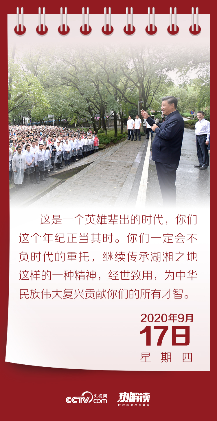 離開校園時,習(xí)近平總書記深情地對師生們說:“岳麓書院一直是我有牽掛,這個學(xué)院在我們的傳統(tǒng)文化中的地位、影響,我還是很有感觸的。”總書記特別剖析了“惟楚有材,于斯為盛”這副古聯(lián)背后的深意:“于斯為盛,我的體會一個就是我們湖南人才濟濟,代有才人出啊,有報效祖國的棟梁之材。再有呢,于斯為盛這個‘斯’,是指的這個時代。明年是第十四個‘五年規(guī)劃’開局之年,是我們開啟‘第二個百年’新征程的起點。這是一個英雄輩出的時代,你們這個年紀(jì)正當(dāng)其時。”