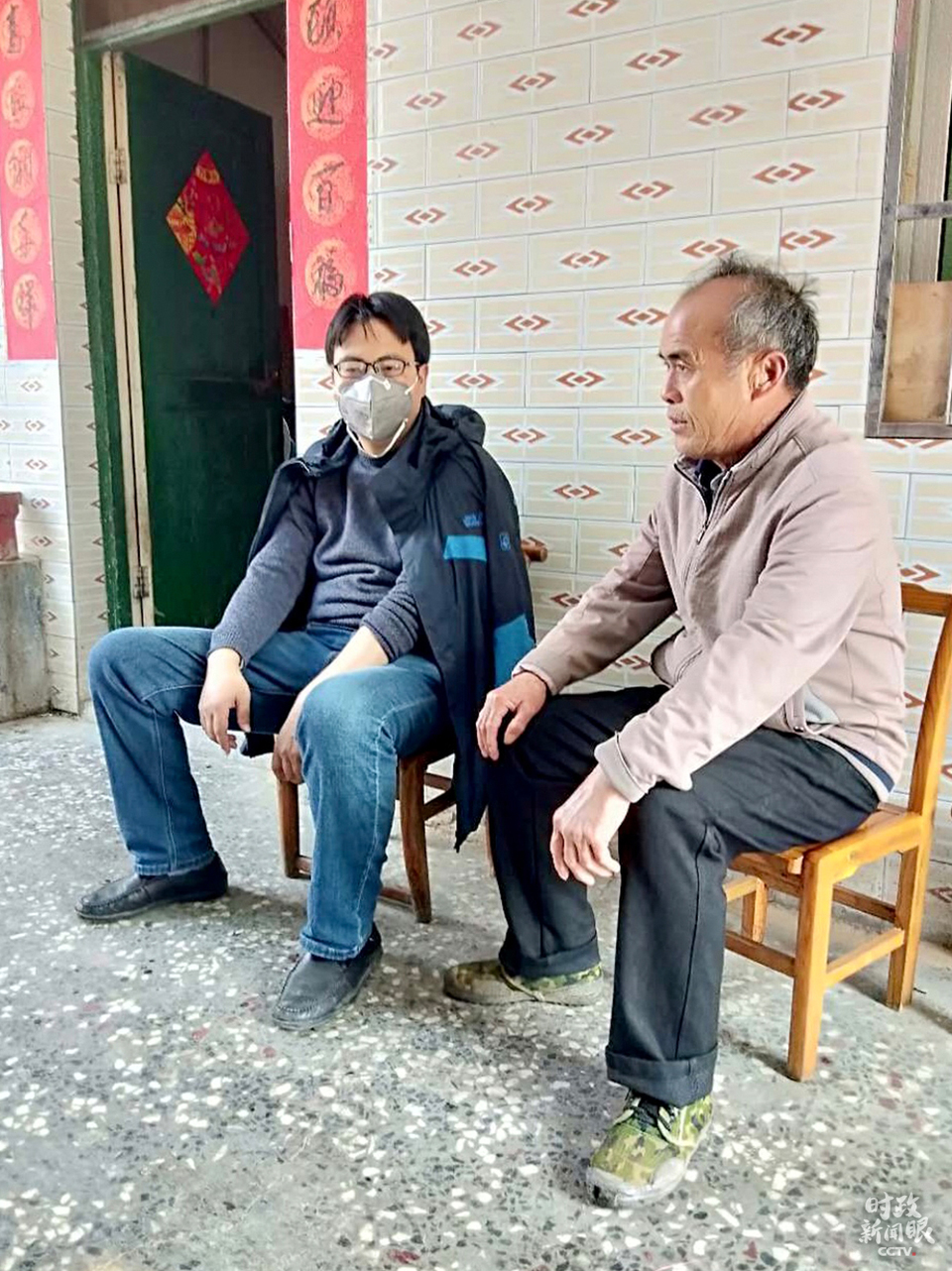 △汝城縣沙洲村扶貧工作隊(duì)隊(duì)長(zhǎng)、村第一書記黃飛(左)看望貧困戶。(總臺(tái)央視記者賈林提供)