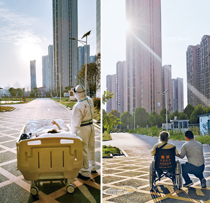 左圖為2020年3月5日,在武漢大學人民醫院東院,復旦大學附屬中山醫院援鄂醫療隊隊員、“90后”醫生劉凱在護送已住院近一個月的87歲老人王欣做CT的途中停下來,一起欣賞了一次久違的日落(甘俊超/攝)。右圖為時隔半年,9月4日,兩個人在武漢大學人民醫院東院重逢,重現攜手看夕陽的溫馨一刻(汪亭玉/攝)。武漢大學人民醫院 杜巍巍供圖