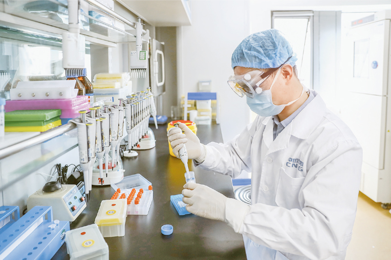 2020年4月11日,工作人員在國藥集團中國生物新冠疫苗生產基地質量檢定部門對新型冠狀病毒滅活疫苗樣品進行雜質檢測。新華社記者 張玉薇/攝