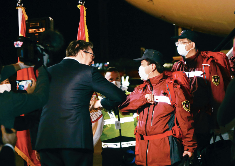 2020年3月21日,在塞爾維亞首都貝爾格萊德,前來迎接的塞爾維亞總統武契奇(左)與中國援助塞爾維亞抗疫醫療專家組成員“碰肘”致意。6名中國專家當天抵達貝爾格萊德,一批由中國政府捐贈的醫療物資也同機抵達。新華社記者 石中玉/攝
